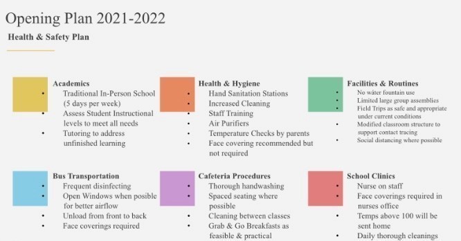 - HEALTH & SAFETY - including hand sanitizing stations, increased cleaning, staff training, air purification, temperature checks by parents, and face coverings recommended but not required.