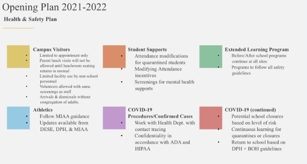 As you are already aware, a joint Covid-19 Fall Guidance document was produced by the Department of Public Health and the Department of Elementary and Secondary Education last week… This document serves as the basis for The Health and Safety Plan for SEBRSD that I am recommending to the School Committee. The Health and Safety Plan for SEBRSD includes the following key elements.