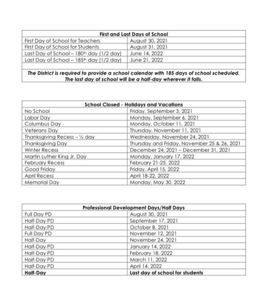 School Calendar: By special request, the updated school calendar for the 2021-2022 academic year as voted by our School Committee is listed below.