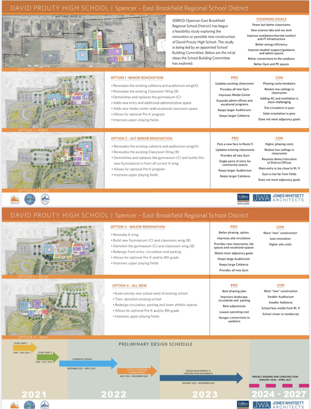 So, you may learn more about our David Prouty High School Project, please check out our preliminary design options as well as the Frequently Asked Questions (FAQ) Bulletin above to learn more, and keep an eye out for our monthly school building committee meetings on Spencer Cable Access.