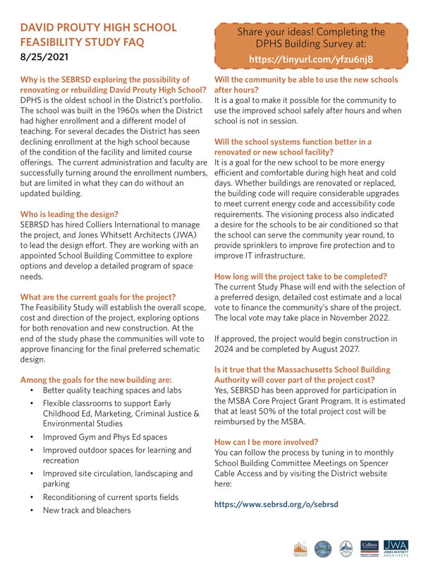 We want and need your input once again! As you know the Spencer-East Brookfield Regional School District through our local School Building Committee has been hard at work throughout the pandemic to keep our building project forward. As a result of our collaborative efforts with the Massachusetts School Building Authority, we are currently in the work of module three, the feasibility study. As part of the feasibility study, we are asking for your input and feedback on our high school building project. This aspect of the “Feasibility Study” is vital to the future of David Prouty High School and the Spencer-East Brookfield Regional School District. Please take a few minutes to complete this important short survey.