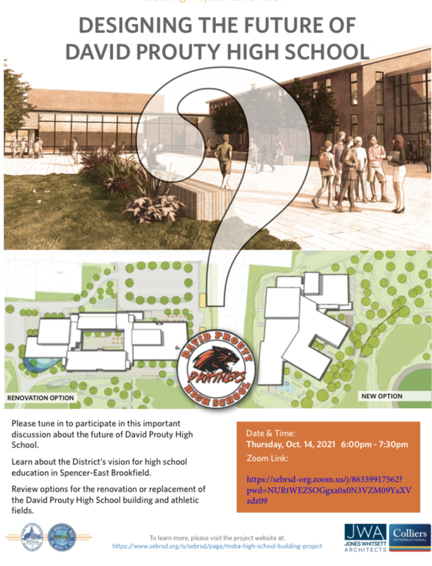 MSBA Update: The David Prouty High School Building Committee continues to move forward at speed in its work on Module III, Feasibility Study. Based upon the feedback from the Massachusetts School Building Authority (MBA) on our Preliminary Design Plan, the local School Building Committee is now ready and prepared to not only survey the communities we serve - but also host a Public Community Forum on Thursday, October 14th, 2021 at 6:00pm. We are looking to host the meeting via Zoom. To login and take part in this public forum, you can join us at: https://sebrsd-org.zoom.us/j/86339917562?pwd=NURtWEZSOGgxa0x0N3VZM09YaXVzdz09.