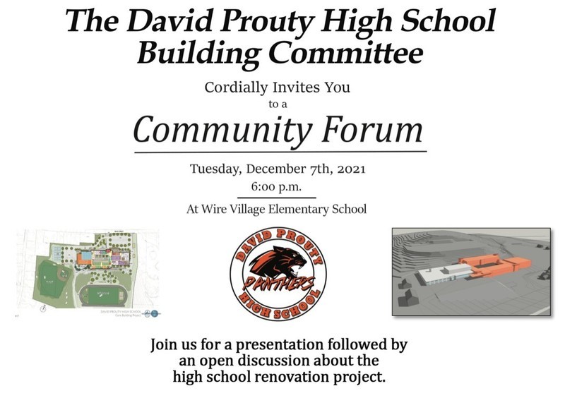 MSBA Update: A Districtwide Community Forum for the David Prouty High School Building project is panned for Tuesday, December 7th, 2021 at 6:00pm at the Wire Village School in Spencer, MA. This community forum will include a brief presentation of our proposed “Addition/Renovation” of David Prouty HS as well as have a question/answer session at the end of the evening. All are welcome to this important in-person event.