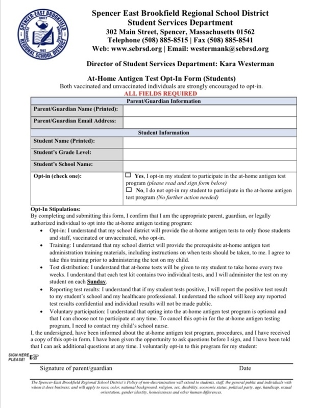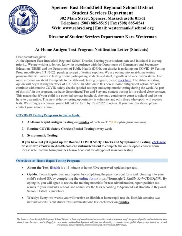 Earlier this morning I learned that the Massachusetts Department of Elementary and Secondary Education (DESE) in partnership with the Department of Public Health (DPH) approved our application to participate in the at-home antigen testing program as well as the diagnostic and routine pool trusting programs. As a result, I am writing to make you aware of the steps you will need to complete as part of the "At-Home Antigen Test Program" begin deployed in the coming days ahead across the Spencer-East Brookfield Regional School District for staff and enrolled students.