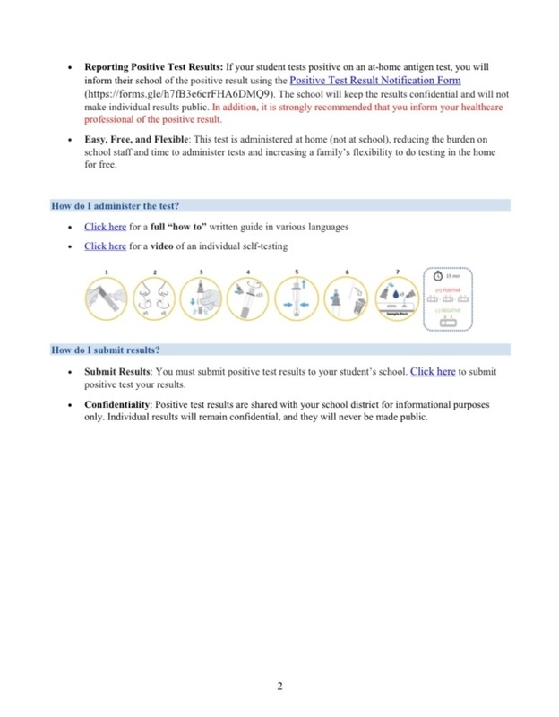 Please see the attached informational letter below regarding implementation of this important program as it is yet another tool in our effort to combat the Covid-19 pandemic. Our goal is to deploy these at-home tests across the district over the next couple of weeks.
