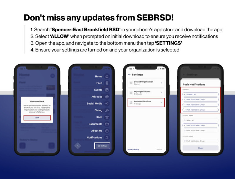 Notification Process: Our district has now transitioned over to our new App and website services as our primary means for delivering the most up-to-date information to your cell phones with our notification feature. To get the App, you can go to the Apple Store or Google Play Store and search for “SEBRSD” then download the App to your phone.